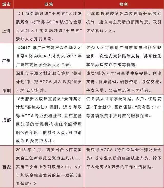 事实上,在这张高端财会证书进入中国30周年之际,国家也越来越重视ACCA持证人,各大城市针对ACCA人才推出的福利优惠政策不胜枚举。